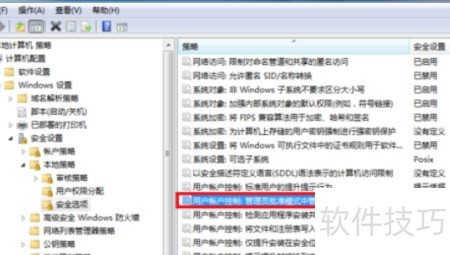 2、 计算机配置中,进入Windows设置的安全设置,选择本地策略下的安全选项,找到用户账户控制,调整管理员在管理审批模式下提升权限时的提示行为。