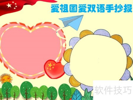 3、 在手抄报左侧绘制爱心形状的文本框,填写有关热爱祖国与双语学习的主题内容。