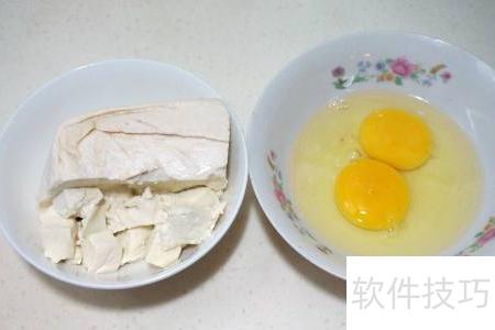 1、 将两个鸡蛋打入碗中,豆腐不必整块使用。