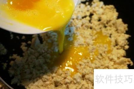 6、 将蛋液倒入豆腐中拌匀,用铲子轻推成小块,凝固后即可盛出。