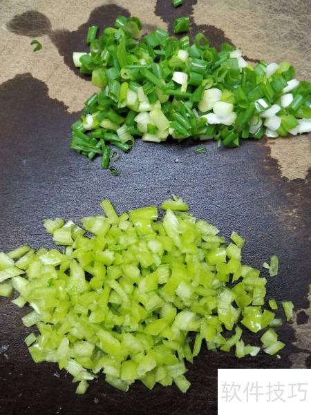 4、 青椒香葱洗净后切碎备用。