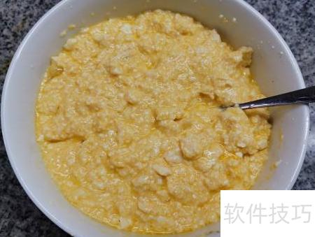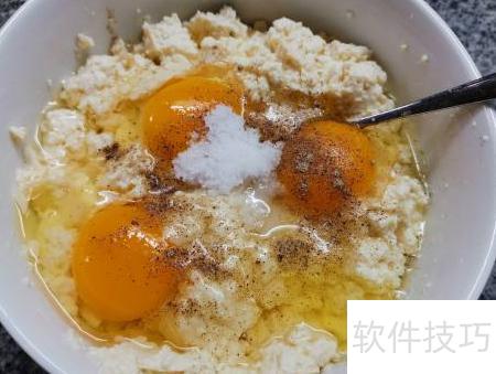 2、 将三个鸡蛋倒入碎豆腐中,加入适量盐和胡椒粉搅拌均匀。