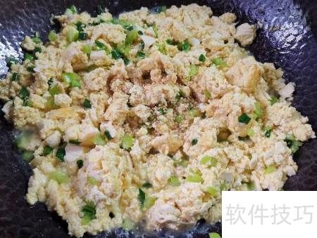 7、 煎好另一面后,加入青椒碎和香葱碎,翻炒至断生即可。