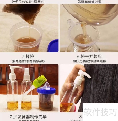 3、 取约120毫升温水注入,静置数分钟,若需充分出胶可等待三小时,揉捏使黏液释出后即可使用。洗发后头发半干时涂抹,无需冲洗,亦可用于日常碎发定型。