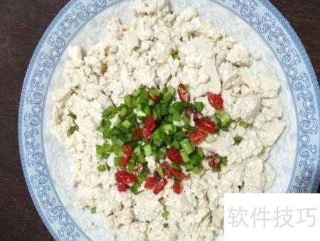 6、 豆腐配大葱、蒜末,加盐糖淀粉和胡椒粉调味。