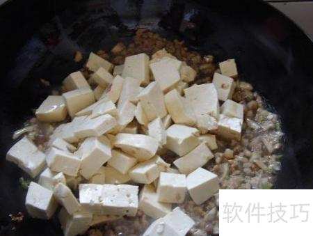 6、 放入豆腐并用铲子将其捣碎