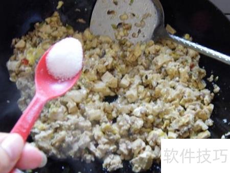 8、 倒入打散的蛋液,快速翻炒至凝固成小颗粒状。