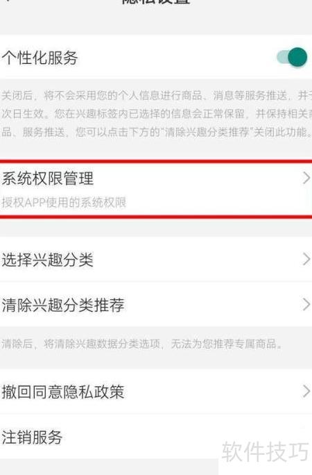 2、 进入隐私设置页面后,找到系统权限管理并点击,六个相关选项将显示。