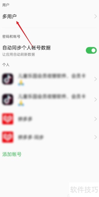 4、 进入用户与账号页面,点击顶部的多用户选项。