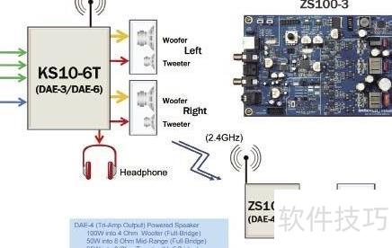 11、 5所示,无线低音炮配套参考设计采用ZS100-3方案。当前条形音响的主箱体普遍追求轻薄外观,导致其低频表现受限,难以满足听觉需求,因此多数产品选择外接无线低音炮以增强低音效果。该设计中,DAE-4 DSP芯片通过内置无线模块接收来自主箱的低音信号,并利用数字信号处理技术进行音频补偿与优化,实现最大100W、10Ω的输出功率。此外,在部分特殊应用中,借助DSP的灵活调节能力,系统可支持100W、50W和25W三种不同功率输出模式,适配多样化产品需求,提升整体音响系统的低频响应性能与使用灵活性。