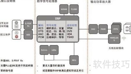 3、 数字信号处理器需大容量存储支持,常需外加MCU处理按键与显示操作,或搭配专用DSP实现虚拟环绕声等音频优化功能。