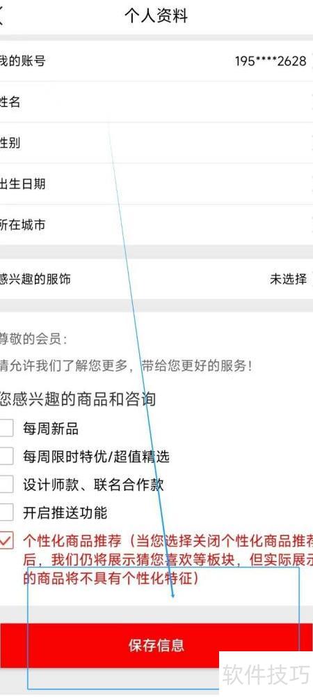 4、 在新页面填写姓名、性别等资料,点击保存信息按钮,即可成功完成个人资料设置。