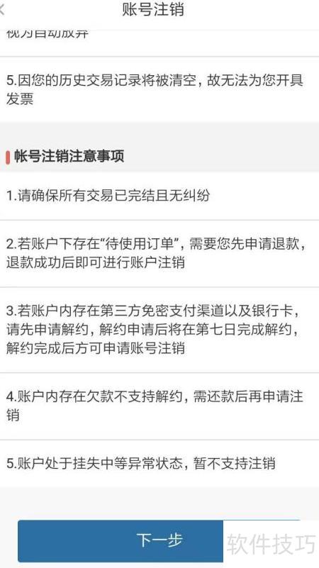 4、 点击后将进入账号注销提示页面,需认真阅读相关注意事项,确认无误后再点击下一步继续操作。