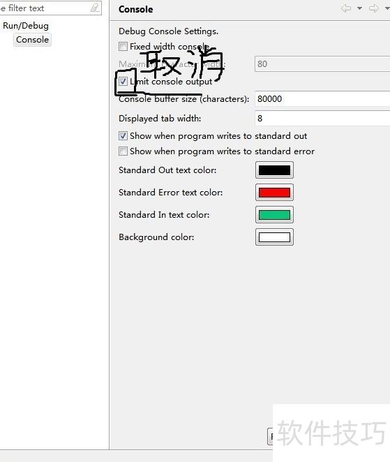 3、 选择后,在弹出窗口中找到limit console output选项,若已勾选,则取消勾选即可。