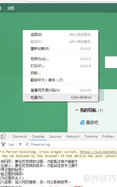 1、 通过Chrome浏览器访问百度首页,右键点击页面并选择检查,切换至Console标签页即可查看相关信息。本文介绍实现该操作的具体方法和步骤,帮助用户快速掌握浏览器开发者工具的使用技巧,便于网页调试与分析。