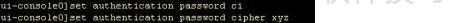 6、 上图显示为明文密码配置,需输入指定密码以设置加密密码:执行命令 set authentication password cipher xyz 完成加密配置。