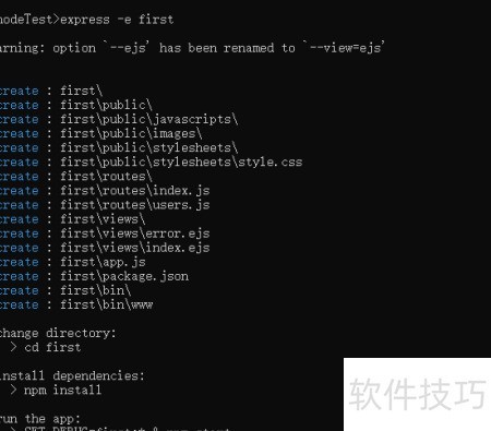 8、 -e 表示使用 ejs 模板,xxx 为自定义项目名称,此处命名为 first。
