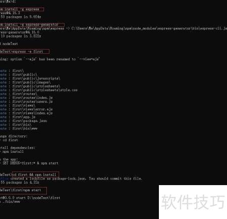 15、 安装完成后,新建项目文件夹中会生成模板文件,表明Express已成功安装,可以开始正常使用。