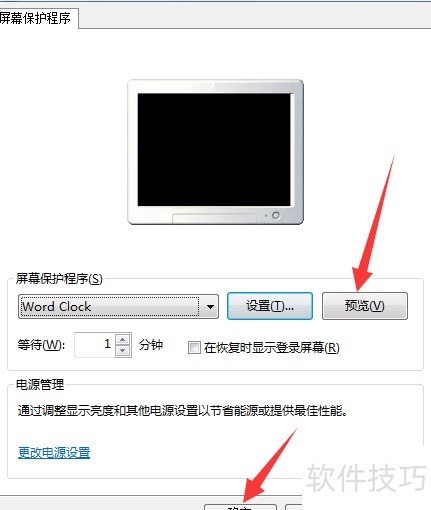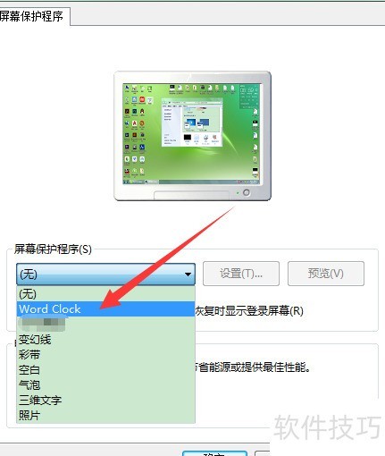 3、 在屏幕保护设置中选取Word时钟。