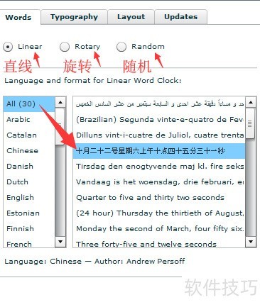 4、 在设置的words选项中,提供直线、旋转和随机三种显示方式,共包含30种语言。通常情况下,选择中文更便于理解和使用,尤其在不熟悉其他语言时更为合适。