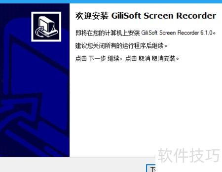 2、 在安装程序GiliSoft Screen Recorder窗口中,进入欢迎界面后,点击下一步按钮继续安装操作。