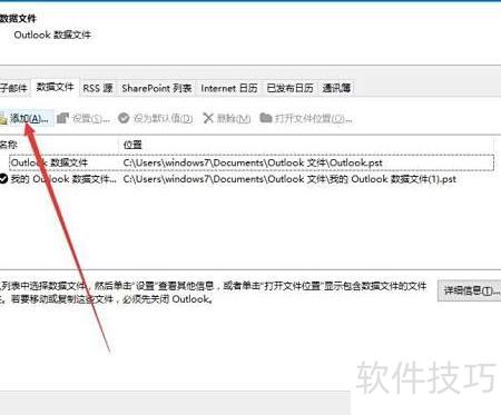 3、 点击添加按钮,选择保存位置为C:Userswindows7DocumentsOutlook文件夹,将Outlook数据文件存入该路径,确认无误后点击确定完成操作。