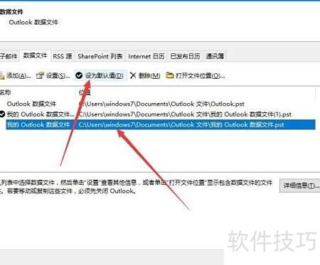 4、 选择新建的Outlook数据文件,点击设为默认即可完成设置。
