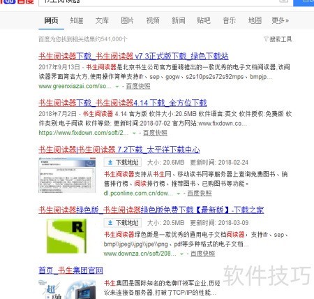 2、 接着搜索书生阅读器,在搜索结果中选择一个下载页面并点击进入。