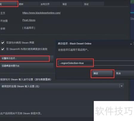 8、 在Steam中右键点击黑色沙漠,选择属性,进入启动选项设置,输入--regionSelection=true并保存。随后重启游戏,即可重新选择服务器区域,方便切换不同区服进行游玩。