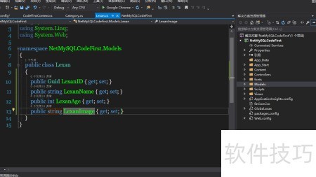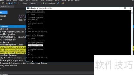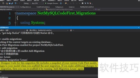8、 完成上述操作后,接下来需在NuGet包管理器控制台中更新数据库连接配置,确保使用名为LexanCodeFirstDb的数据库,并启用迁移功能。随后添加新的迁移记录。具体操作是打开软件包管理器控制台,输入指定命令并执行,中所示步骤进行即可顺利完成配置与迁移。