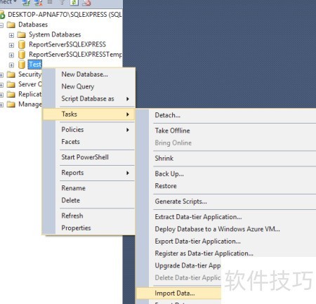 4、 在新建的测试数据库上右键单击,依次选择任务和导入数据选项。