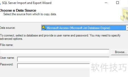 6、 接下来请打开文件南E,点击浏览按钮,找到需要导入的文件路径,随后选择并打开Access数据库。需特别注意,数据库文件不可采用Access 2007或更新版本的ACCDB格式,因为SQL Server无法识别该格式。若当前数据库为2007至2016年版本,请务必先将其转换为2002-2003版本的MDB格式,再执行导入操作,以确保兼容性与数据顺利迁移。
