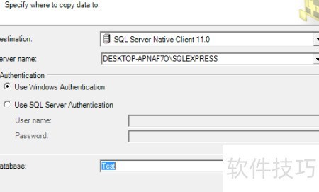 7、 来吧,接着点击下一步选择目标位置。由于你已在目标数据库上单击右键,它通常会自动出现在列表中。若未显示,请从目标 SQL Native Client 的下拉菜单中手动选择。在服务器名称处找到对应的数据库实例,然后根据你选择的身份验证方式,在下方选取具体的数据库即可完成设置。