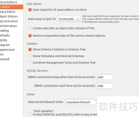 3、 在workbench左侧栏选择SQL Editor,找到最后一行的Safe Updates……选项,将其勾选取消即可完成设置。