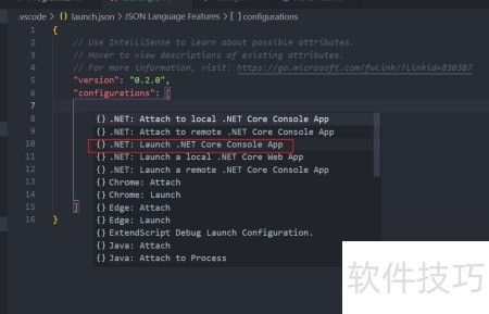 5、 随后将打开launch.json文件,在默认弹出的菜单里选择.NET Core控制台应用。