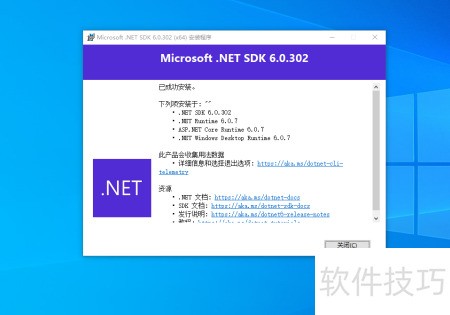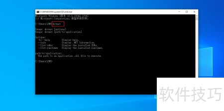 4、 等待步骤3的安装程序结束后,按下Win+R键打开运行窗口,输入cmd进入命令提示符,执行dotnet命令。若显示内容,则表示安装成功并可正常使用。