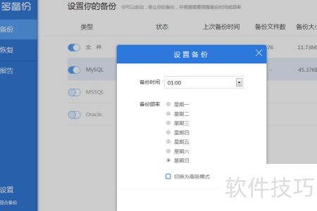 7、 最关键的步骤是开启自动备份。点击设置频率,可选定每周具体某天的某一时刻进行备份;若选择高级模式,更可精确到分钟级。设定完成后点击确认,即可实现自动备份功能,操作简便高效。