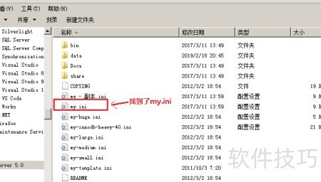7、 在 MySQL Server 5.0 的安装目录中查找并打开 my.ini 配置文件。