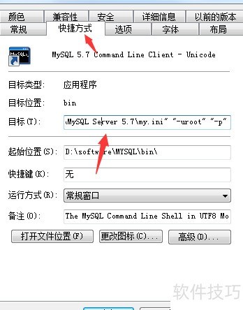 3、 在属性的快捷方式中,目标路径指向一个名为my.ini的文件,但实际目录中并不存在该文件,正因如此,程序启动时因找不到必要配置文件而立即关闭,导致界面一闪而过。