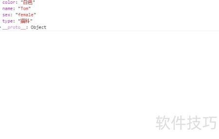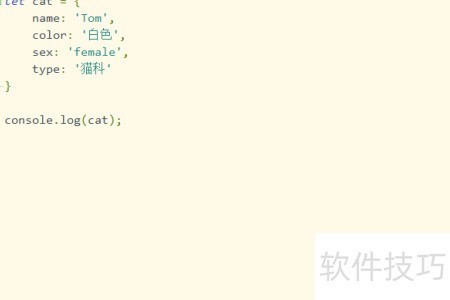 1、 在新建的JavaScript文件中,创建一个名为cat的对象,为其添加name、color、sex和type四个属性,随后输出该对象内容,具体效果所示。