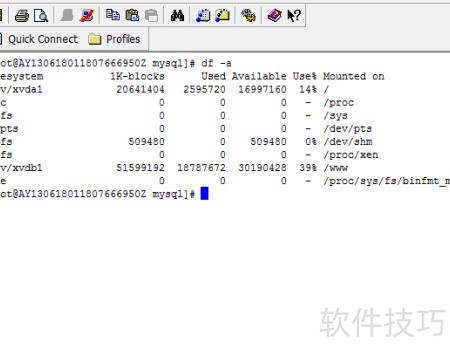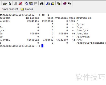 5、 尝试重启mysqld服务均未成功,于是检查系统磁盘使用情况。执行df -a命令后发现,系统盘/dev/vxda1的使用率已达100%,导致服务无法正常重启。