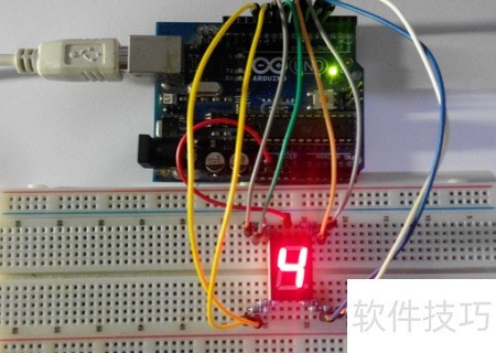 26、 通过USB线将实验电路与电脑连接,此时USB线为整个系统提供电源。在正确完成硬件连接后,数码管会自动循环显示从0到9的数字,持续不断,直至断开UNO控制器的供电。具体的数字显示效果如附图所示。