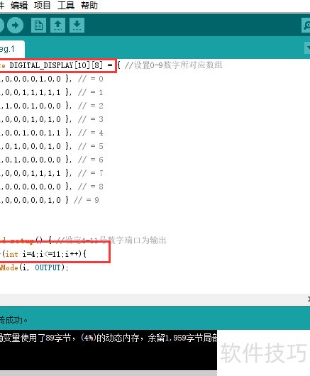 5、 设置4至11号数字引脚为输出模式,初始化相关参数。