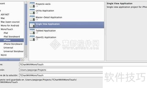 2、 启动MonoDevelop集成开发环境,选择新建解决方案,依次进入C、MonoTouch、iPhone,然后点击单视图应用程序(从文件创建)。为项目输入一个具有描述性的名称,例如TChartWithMonoTouch,确认无误后点击确定按钮,系统将自动生成相应的项目结构和初始文件,为后续的iOS应用开发做好准备。