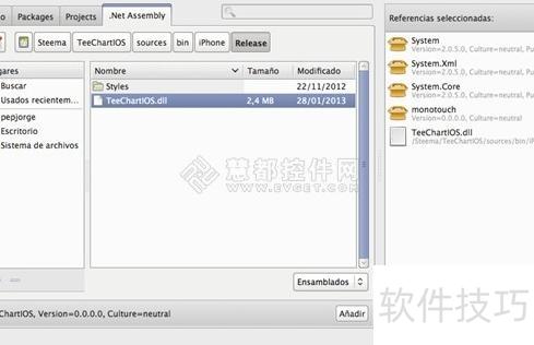 5、 在项目中添加TeeChart NET for iOS库时,首先右键点击引用,选择编辑引用,进入NET程序集选项卡,从中找到并添加安全程序内的TeeChartIOS.dll文件,确认无误后点击确定完成操作。