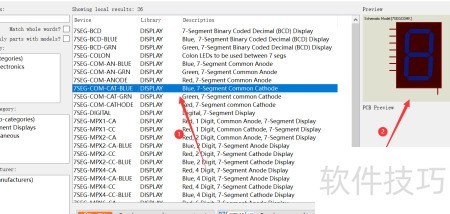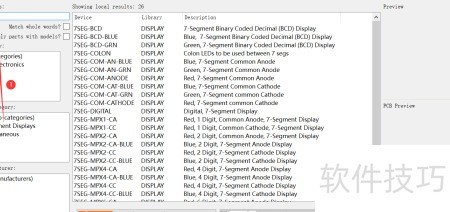 6、 在选择设备窗口的关键词栏输入7SEG,查找对应的数码管元件。