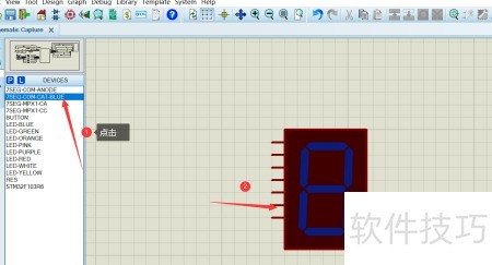 10、 在左侧DEVICES框内选择所需数码管类型,点击组件界面即可完成添加。