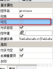 11、 点击省份控件,进入属性表的基本属性,取消可见性勾选,操作所示。