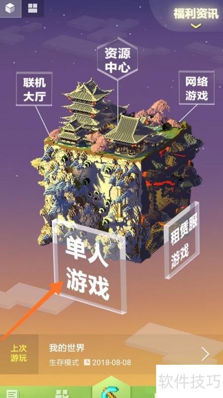 2、 进入游戏主界面后,可见联机大厅、单人游戏和租赁服务器等选项,选择单人游戏即可开始,操作所示。