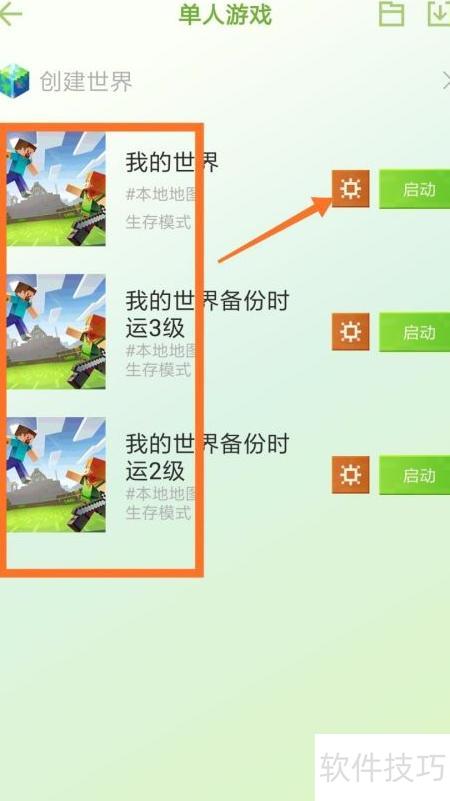 3、 进入单人游戏后,可见三个已创建的地图存档,点击任意存档右上角的设置图标,操作所示。